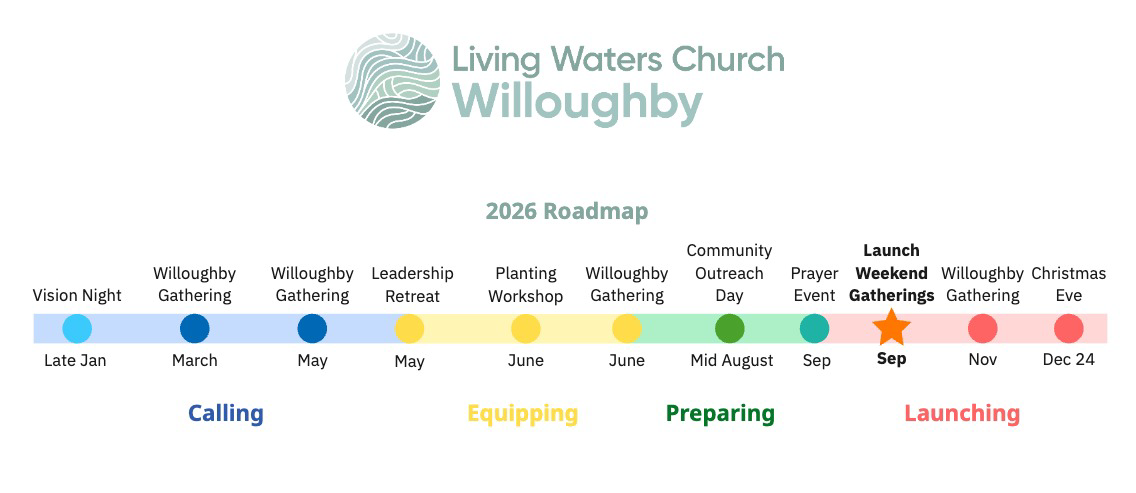 See below our rough roadmap of important events and dates, as we plan for our September 2026 launch of a weekend service. Not included in this roadmap are the various programs and events we regularly host.
