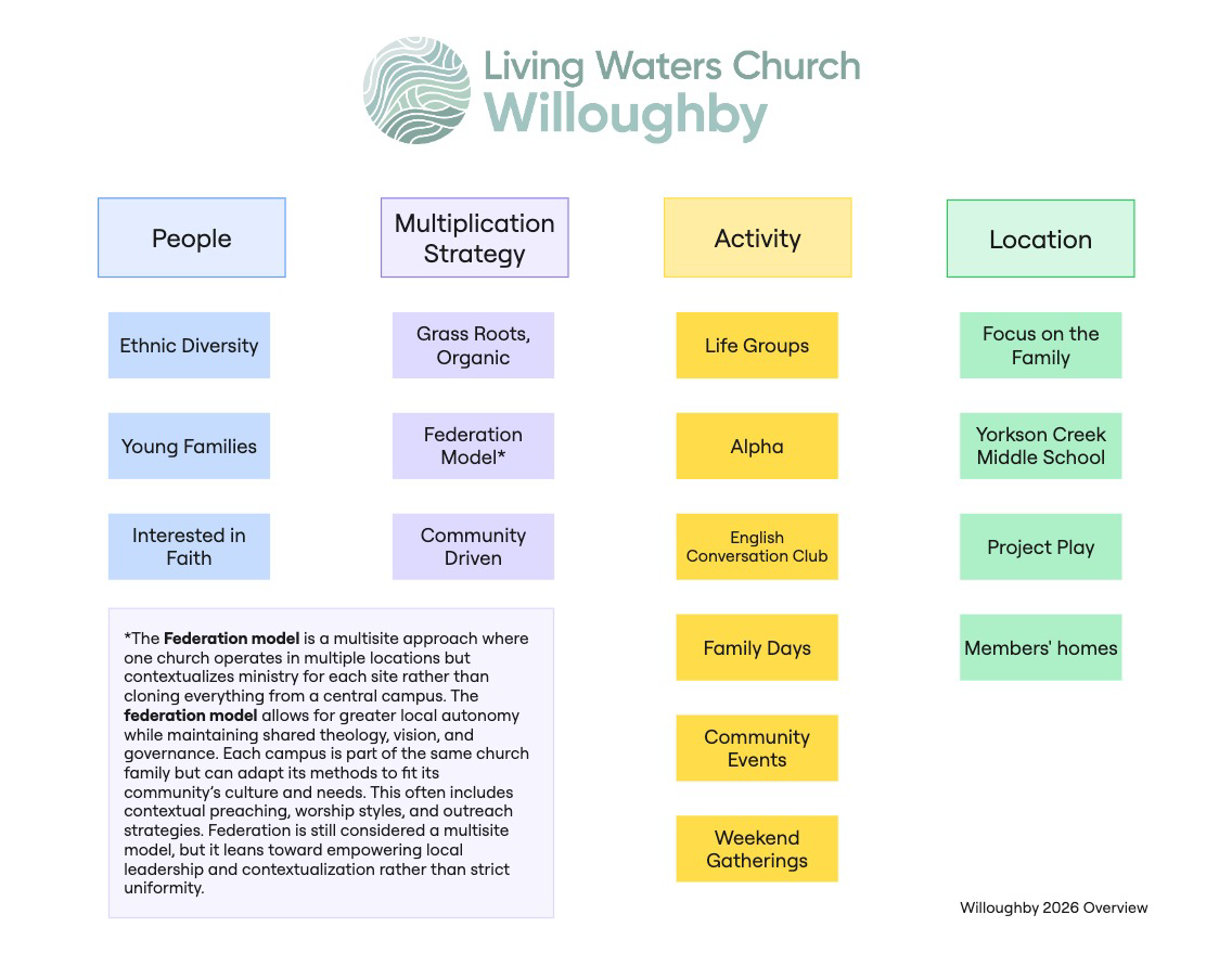 We do believe that a September 2026 launch of weekend services is not only possible, but necessary. We believe weekend gatherings will complement our ministry and serving in the Willoughby community.